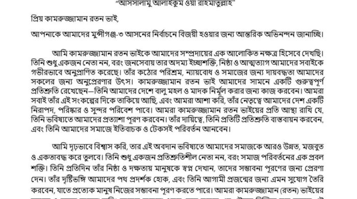 মুন্সিগঞ্জ-৩ আসনের নির্বাচনে কামরুজ্জামান রতনের বিজয়ে ফয়েজ আহমেদ শিকদারের অভিনন্দন