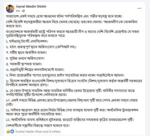 ১২. অর্থনৈতিক-ব্যবসা প্রতিষ্ঠানে লুটতরাজ, ভাড়াটে ব্যক্তিদের সহায়তায় কৃত্রিম মবভায়োলেন্স সৃষ্টি। দেশবাসীকে সন্ত্রাসীর বিরুদ্ধে সজাগ থাকতে হবে।